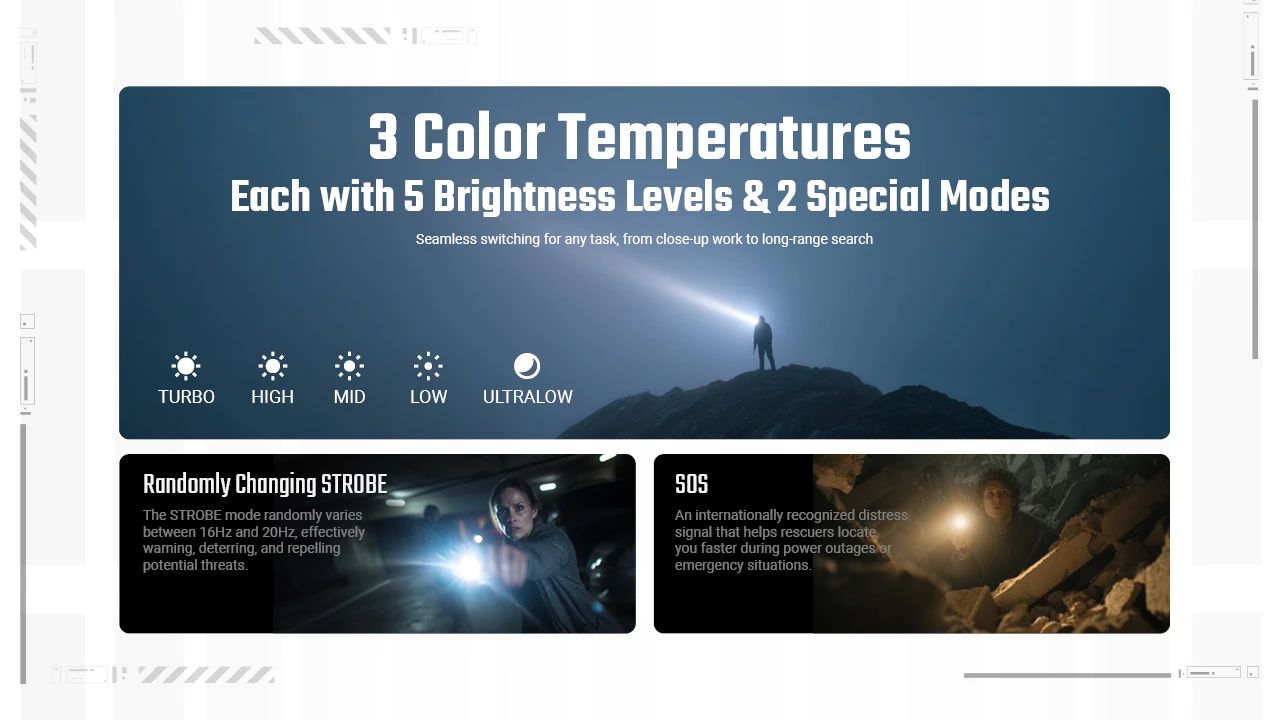 • Op til 1500 lumens, 3 farvetemperaturer med hver 5 lysstyrker, Strobe og SOS